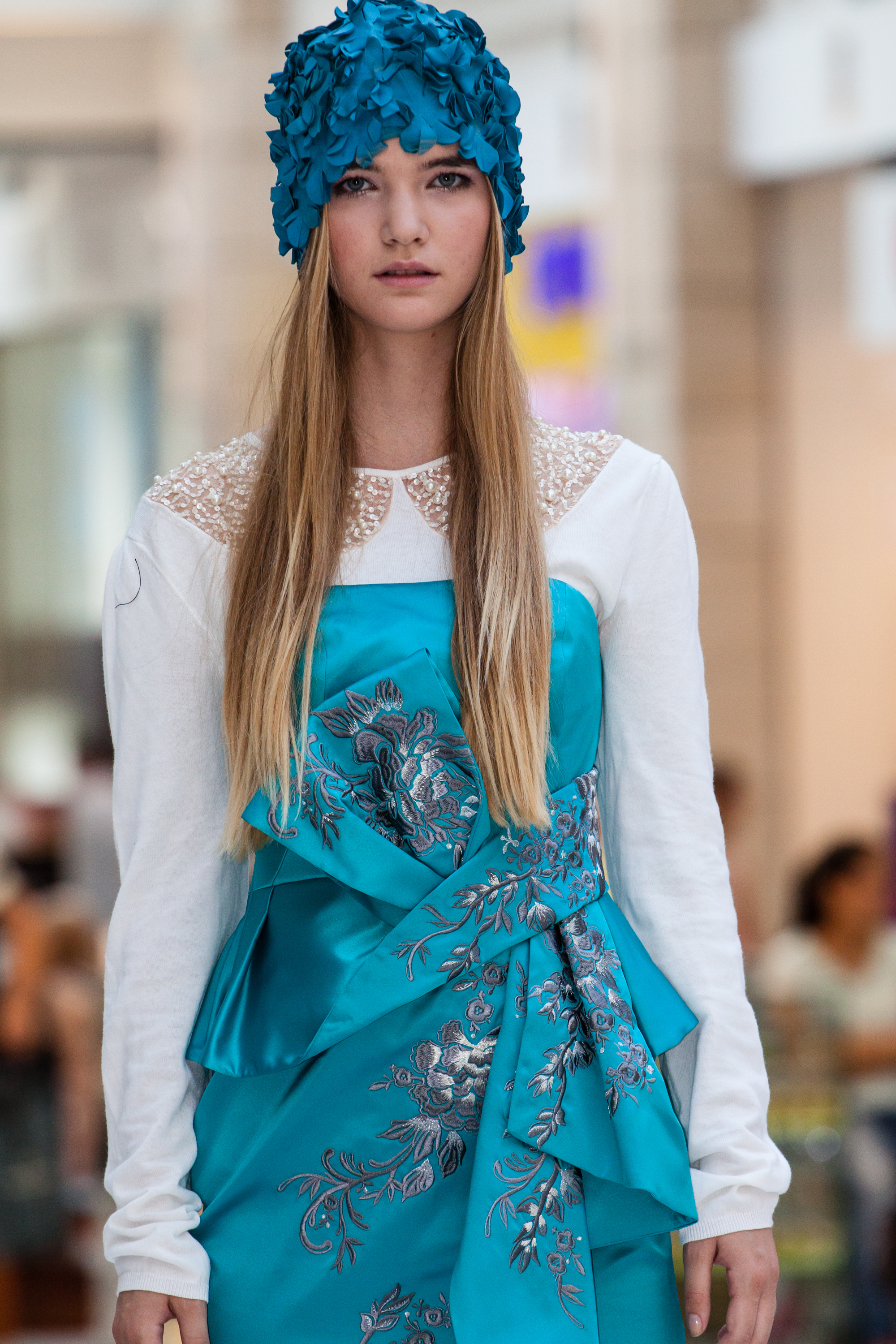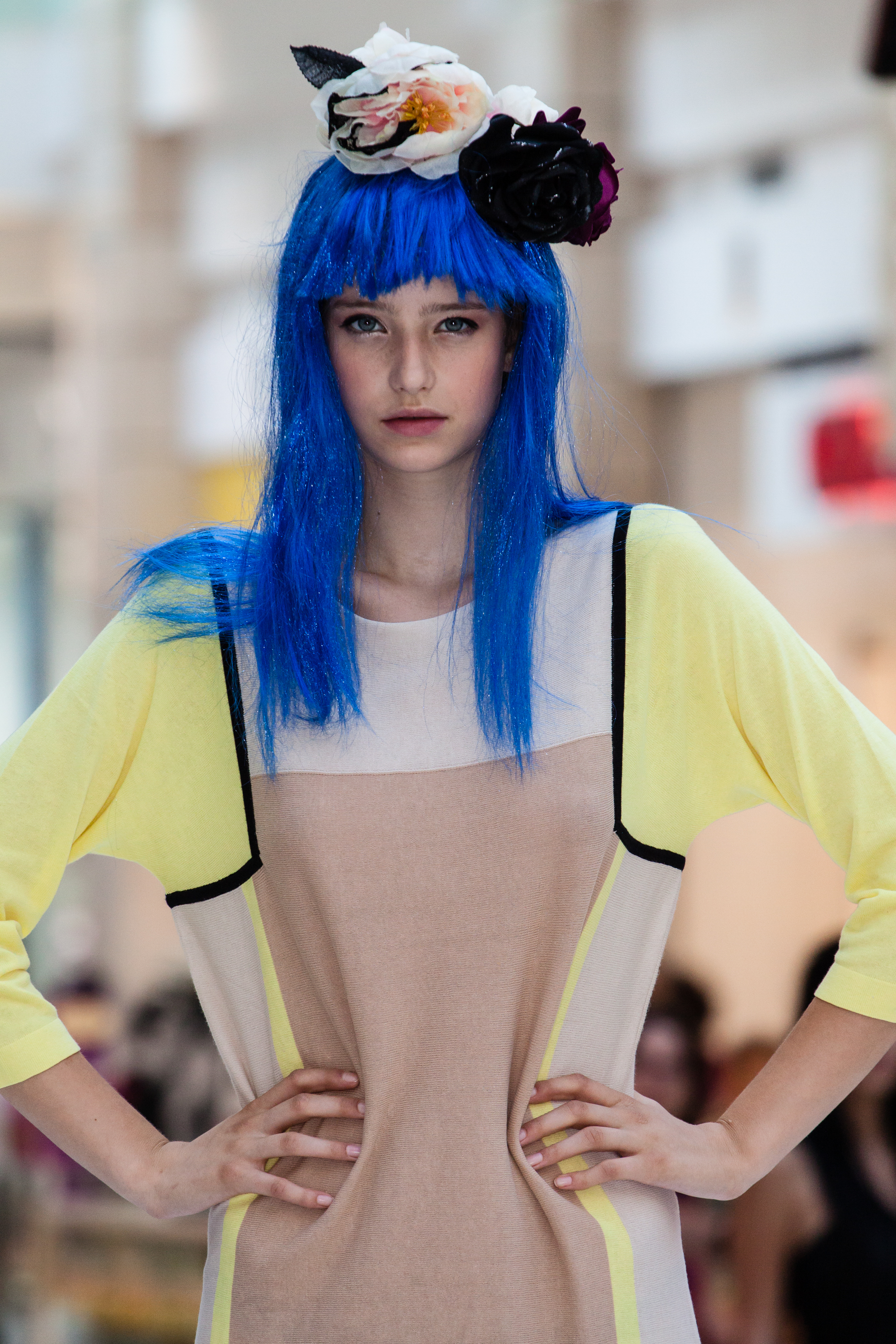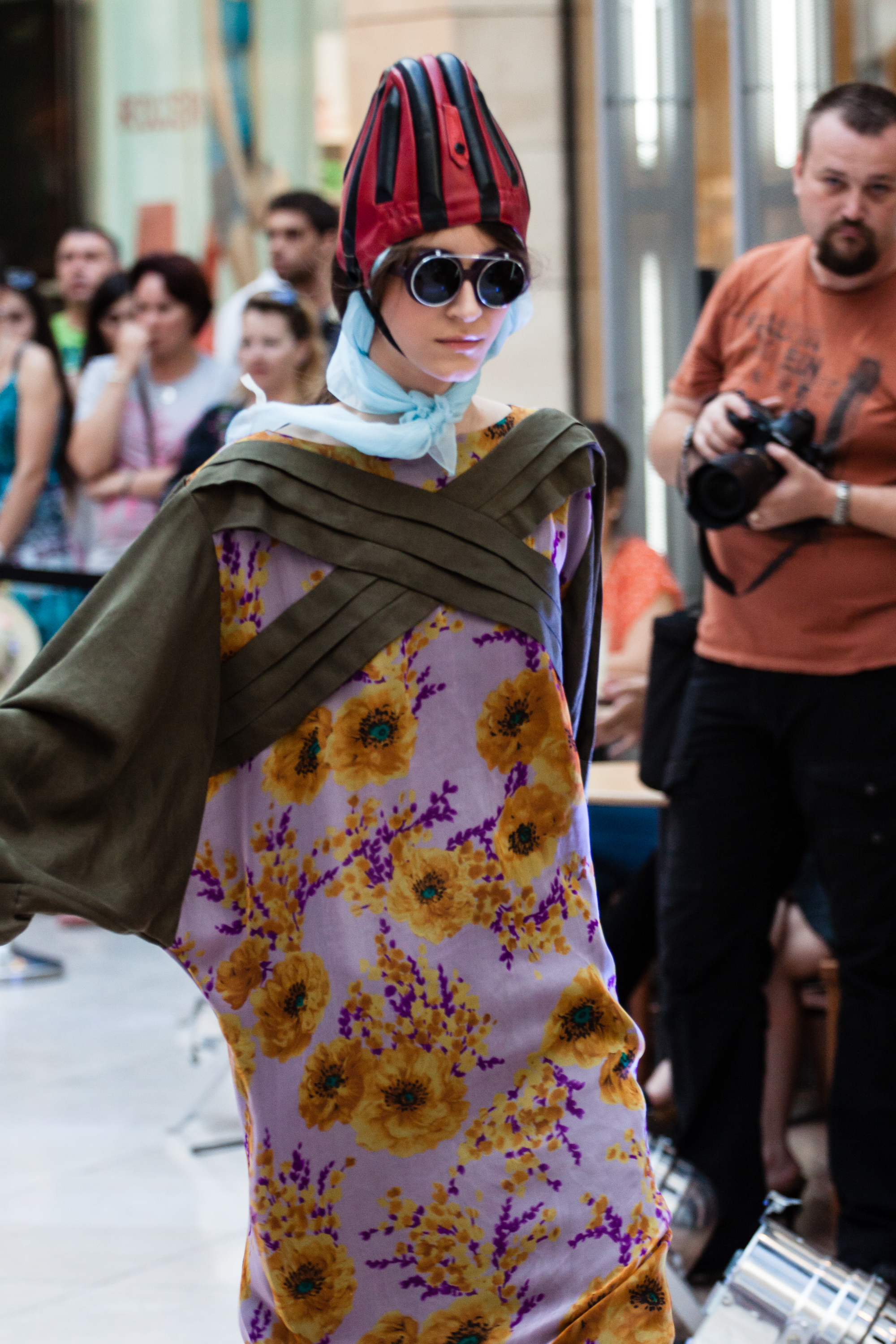 Madalina is wearing Karen Milen top and dress, Stefanel shoes ans vintage shower cap