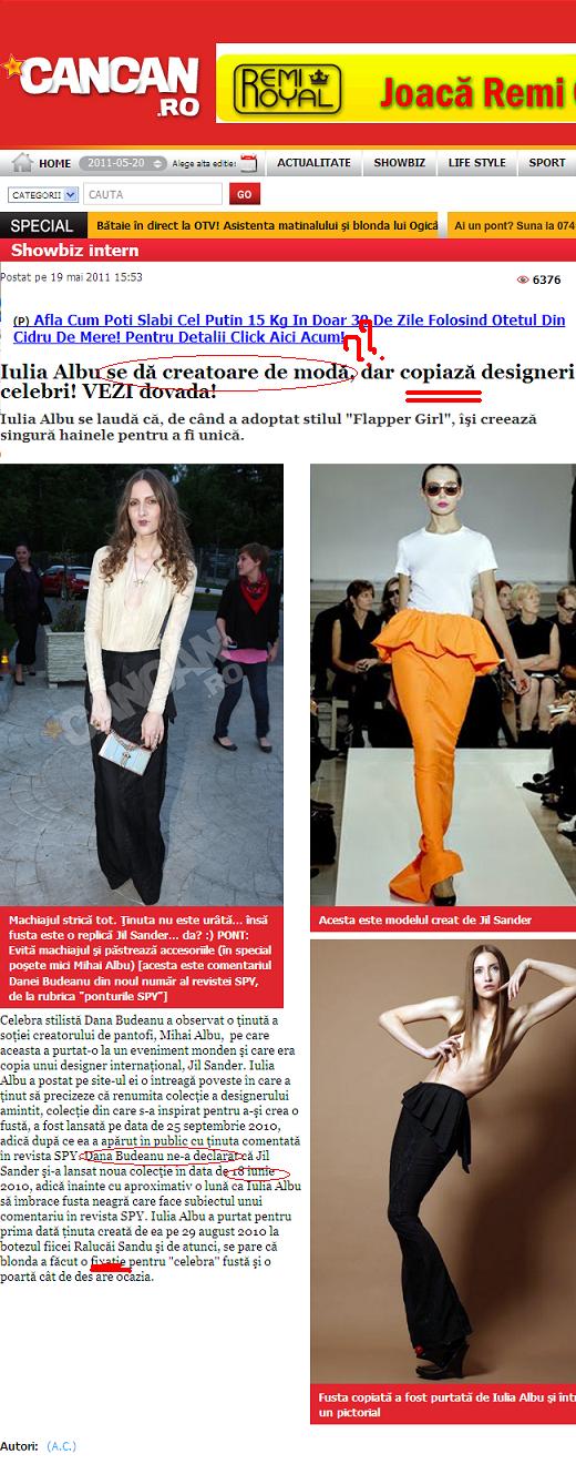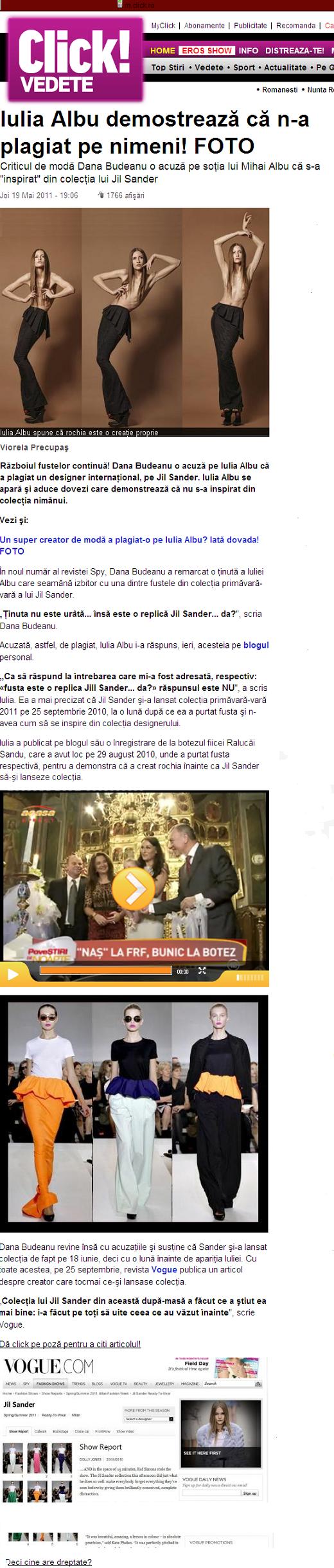 Revenind cu picioarele pe pamant, lucrurile sunt cat se poate de simple: pe cei de la Jil Sander cu siguranta nu ii intereseaza nici revista SPY si nici IULIA ALBU. In moda lucrurile sunt ciclice, TOTUL a fost facut si rar ne mai surpride ceva.