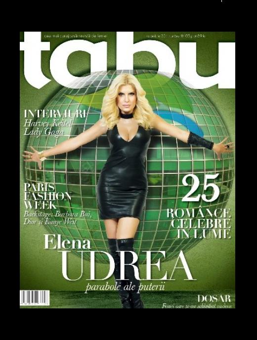 Elena Udrea nu s-a ferit niciodata sa pozeze si nici revistele nu s-au sfiit sa ii propuna pictoriale inedite. Cu NOUA aparitie pe coperta TABU a acestei luni, Elena Udrea a marcat cea de-a patra coperta glossy. Nu voi comenta calitatea pictorialului si nici nu voi emite judecati de valoarea in privinta calitatilor doamnei Udrea din niciun punct de vedere.