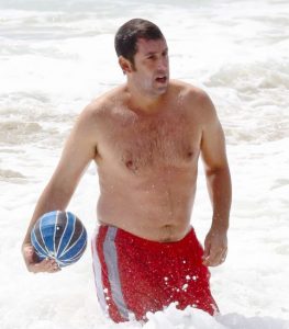 Adam Sandle cu o minge în mână și cu o alta în jurul taliei. Deloc sănătos, aș putea spune, nici pentru noi și, cu siguranță, nici pentru el.