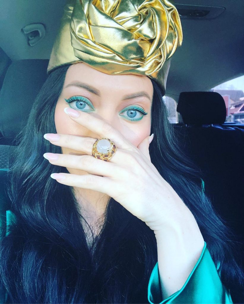 Gina Pistol ne invită să admirăm un peisaj cu stele sau soare. Nu mă pot concentra foarte bine din cauza verdelui din fundal. Știți că urăsc verdele, nu-i așa?