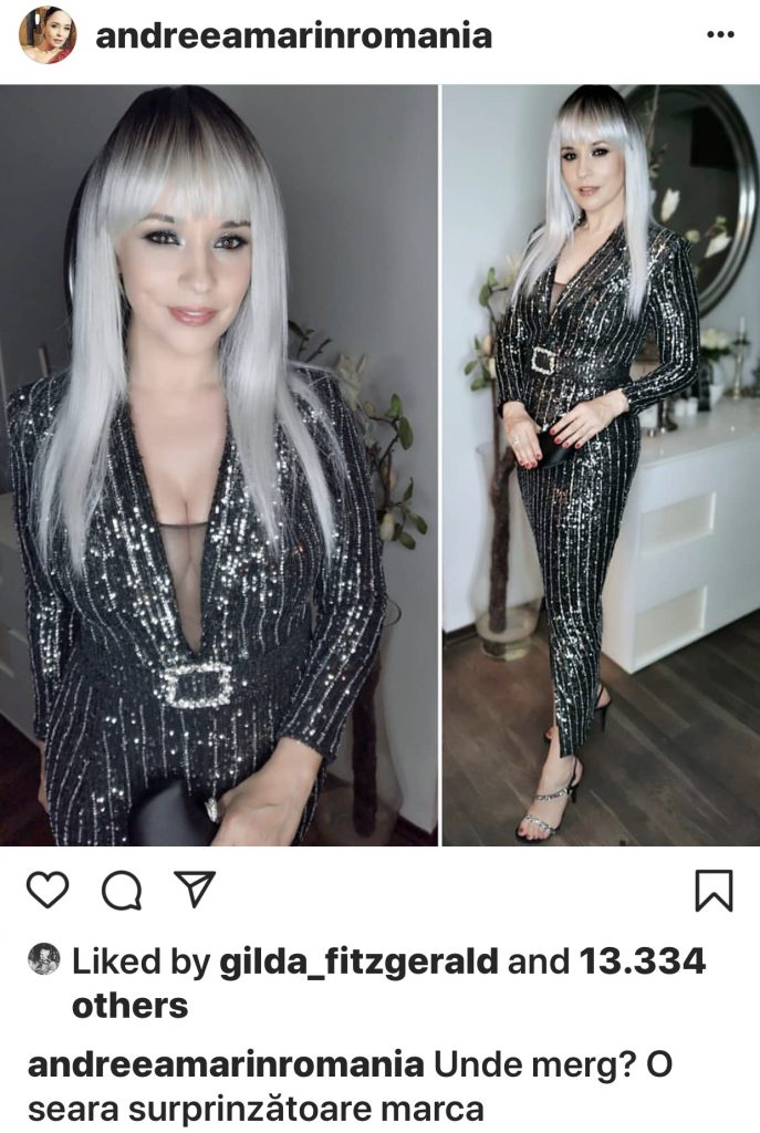 Andreea Marin începe să semene suspect de mult cu Sânziană Buruiană. “Zâna Pătrunjel”, numită așa după celebra pățanie cu frunzulița dintre dinți, este toată un argintiu cu negru și o perucă. Mai nou, “colegele ei de endorsement” sunt Andreea Bălan, la fel de neinspirată din păcate, Oti (Bravo aveai stil) și Raluca Pastramă. Superb! Niciodată nu purtați rochii/salopete/bluze/trențe cu inserții din tulle elastic. Arată ieftin și Made în China… Perucile blond platinat nu pot fi purtate cu orice nuanța a pielii și în niciun caz așezate pe ceea ce pot doar să suspectez că este un pig tail în vârful capului. Voi unde credeti ca merge totuși? BAU