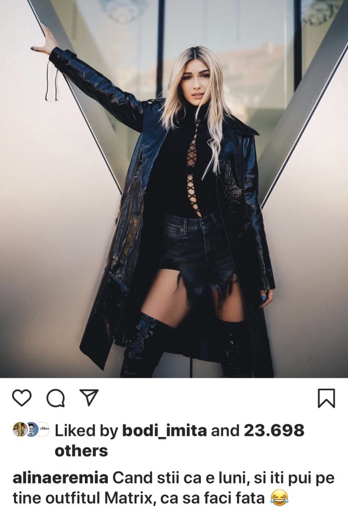 Alina Eremia incearcă să facă ceva stylish, doar în mintea ei “Matrix”, dar, eșuează într-un scutec nereușit. Acel body/top nu mai avea nevoie și de un sutien care sa ascundă CE? Întreaga ținută crează impresia de gât scurt sau lipsă și îi dă Alinei un aspect încropit și vulgar. Barter much? -61.9